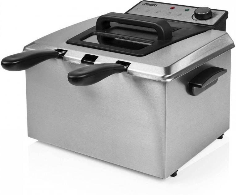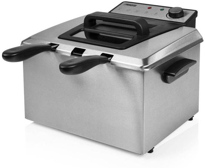 Bak frietjes en snacks voor je hele familie in de semiprofessionele Princess 185000 Frituurpan- Deze extra ruime frituurpan heeft een inhoud van maar liefst 5 liter en kan gebruikt worden met één groot of twee medium frituurmandjes voor het tegelijkertijd bakken van friet en snacks- Dankzij het zeer krachtige vermogen van 3270 Watt is de frituurpan in ongeveer vijf minuten op temperatuur- Koude zone voor gezonder frituren Een probleem van veel friteuses is dat restjes in het hete vet terechtkomen en dan bij elk gebruik verbranden- De Princess Frituurpan heeft om dit te voorkomen een speciale koude zone- Alle kleine stukjes die door het mandje heen vallen komen in deze koude zone terecht en verbranden niet- Door middel van het veiligheidsfilter kan je deze restjes makkelijk uit de olie filteren- Zo gaat je olie langer mee en krijg je geen ongezonde verbrande restjes op je gefrituurde producten- Extra groot volume De Princess 185000 Frituurpan is speciaal voor grote gezinnen of mensen die graag hun vrienden trakteren op snacks- Bij de frituurpan ontvang je 3 mandjes: een groot mandje en twee medium mandjes- Zo kies je zelf of je heel veel frietjes bakt of dat je per mandje apart verschillende snacks bereid- Zeer veilig in gebruik De Princess Frituurpan is speciaal ontworpen om zo veilig mogelijk gebruikt te worden- De mandjes kan aan de binnenkant van de friteuse opgehangen worden waardoor de frietjes kunnen uitlekken en er geen hete olie langs de buitenkant loopt- Daarnaast heeft de frituurpan een overhittingsbeveiliging en kan je hem eenvoudig verplaatsen dankzij de stevige handvaten- Deksel met filter en kijkvenster De Princess Friteuse heeft een filter in de deksel waardoor de vieze frituurlucht beperkt wordt en je minder last hebt van een frituurlucht die in huis blijft hangen- Via het kijkvenster kan je makkelijk het bakproces in de gaten houden zonder de frituur te openen- Makkelijk schoon te maken De emaille binnenpan van de Princess Frituurpan is uitneembaar zodat je makkelijk de olie kan verversen en de binnenpan in de vaatwasser kan plaatsen- De gehele frietpan is eenvoudig uit elkaar te halen en de meeste onderdelen zijn vaatwasserbestendig dus het schoonmaken is gemakkelijk- Het handvat kan eenvoudig los geklikt worden van het mandje zodat deze ook makkelijk gereinigd kan worden- Wat vind je in de doos: Princess Frituurpan, 1 groot frituurmandje, 2 medium frituurmandjes, uitneembare emaille binnenpan, handleiding Redenen om voor de Princess Frituurpan te kiezen: * Bak genoeg frietjes voor je hele gezin dankzij de extra grote inhoud van 5 liter * De koude zone voorkomt verbrande restjes zodat je de olie minder vaak hoeft te vervangen * Inclusief 3 mandjes om tegelijkertijd friet en snacks of verschillende snacks te kunnen bakken * Makkelijk schoon te maken dankzij de vaatwasserbestendige onderdelen * Extreem krachtig vermogen van 3270 Watt zodat de friteuse snel op temperatuur is.